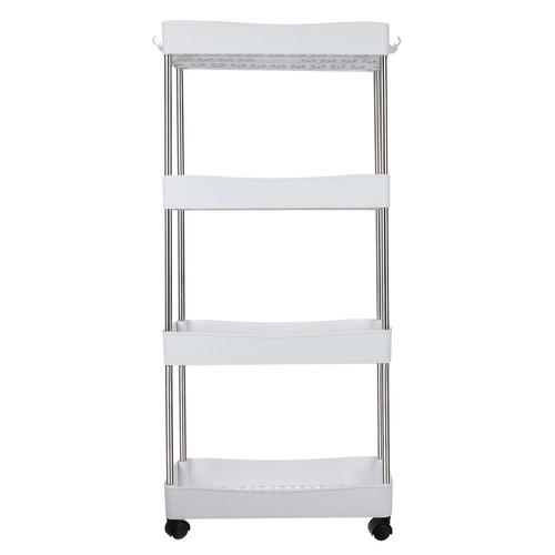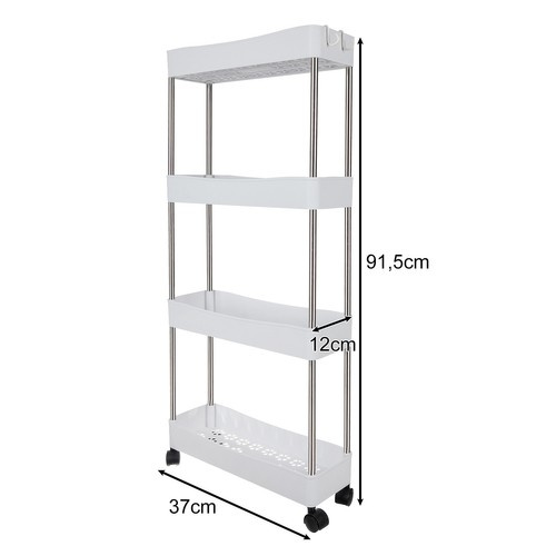- SPECYFIKACJA PÓŁKI kolor: biały; materiał: PP, stal nierdzewna; materiał kółek: PP; ilość poziomów: 4; na kółkach: tak; łatwy montaż: tak; wysokość od podstawy dolnej półki do górnej: 26 cm; wymiary: 91,5 x 37 x 12cm; waga: 0,78 kg; waga w opakowaniu: 0,98 kg