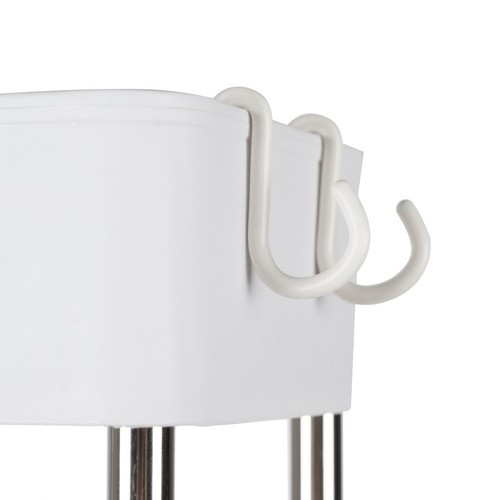 - PRAKTYCZNE HACZYKI – W zestawie z półką łazienkową znajdują się również cztery haczyki wykonane z materiału PP, które można łatwo przymocować do krawędzi półek. Haczyki te są idealnym miejscem do zawieszenia ręczników, gąbek, szczotek czy innych małych akcesoriów łazienkowych, co dodatkowo zwiększa funkcjonalność półki. Dodatkowym atutem półki są cztery obrotowe kółka, które umożliwiają jej swobodne przemieszczanie. Kółka obracają się o 360 stopni, co zapewnia maksymalną mobilność i ułatwia przesuwanie półki nawet w wąskich przestrzeniach łazienki. Dzięki temu, półka może być łatwo przestawiana tam, gdzie jest najbardziej potrzebna, bez konieczności jej dźwigania.