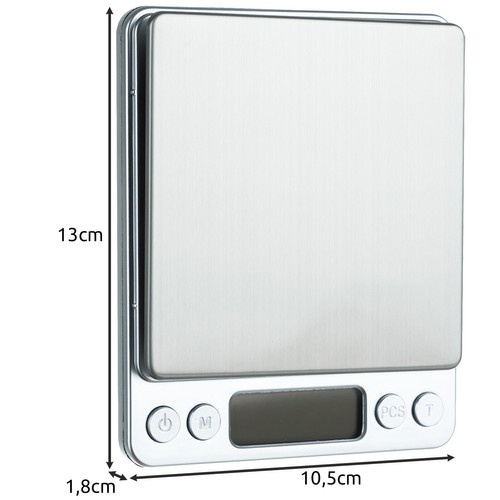 - SPECYFIKACJA – zakres pomiaru: 0-0,5kg; dokładność pomiaru: 0,01g; jednostki miary: g/oz/ozt/dwz/ct/gn/tl; materiał: stal nierdzewna, obudowa ABS; wyświetlacz: LCD podświetlany na niebiesko; zasilanie: 2 x bateria AAA (w zestawie); wymiary wagi: 13×10,5×1,8cm; wymiary szalki: 10x10cm; waga: 205g; waga w opakowaniu: 234 g.