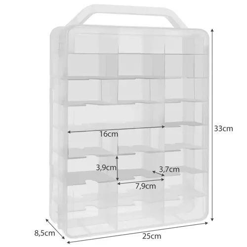 - SPECYFIKACJA – kolor: bezbarwny; materiał: PP (polipropylen); ilość przegródek: 46; wymiar dużej przegródki: 16 x 3,9 cm; wymiar małej przegródki: 7,9×3,9 cm; wymiary walizki: 33x25x8,5 cm; waga: 0,820 kg; waga w opakowaniu: 1,020 kg.