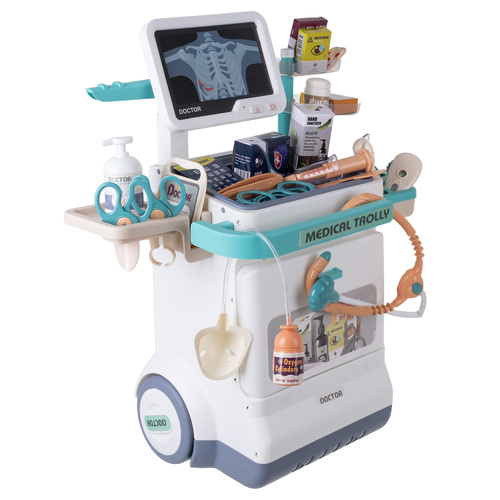 – Prawdziwa stacja medyczna w domu – duży wózek lekarski z panelem EKG i RTG, półeczkami oraz efektami świetlno-dźwiękowymi pozwala dziecku poczuć się jak prawdziwy doktor.